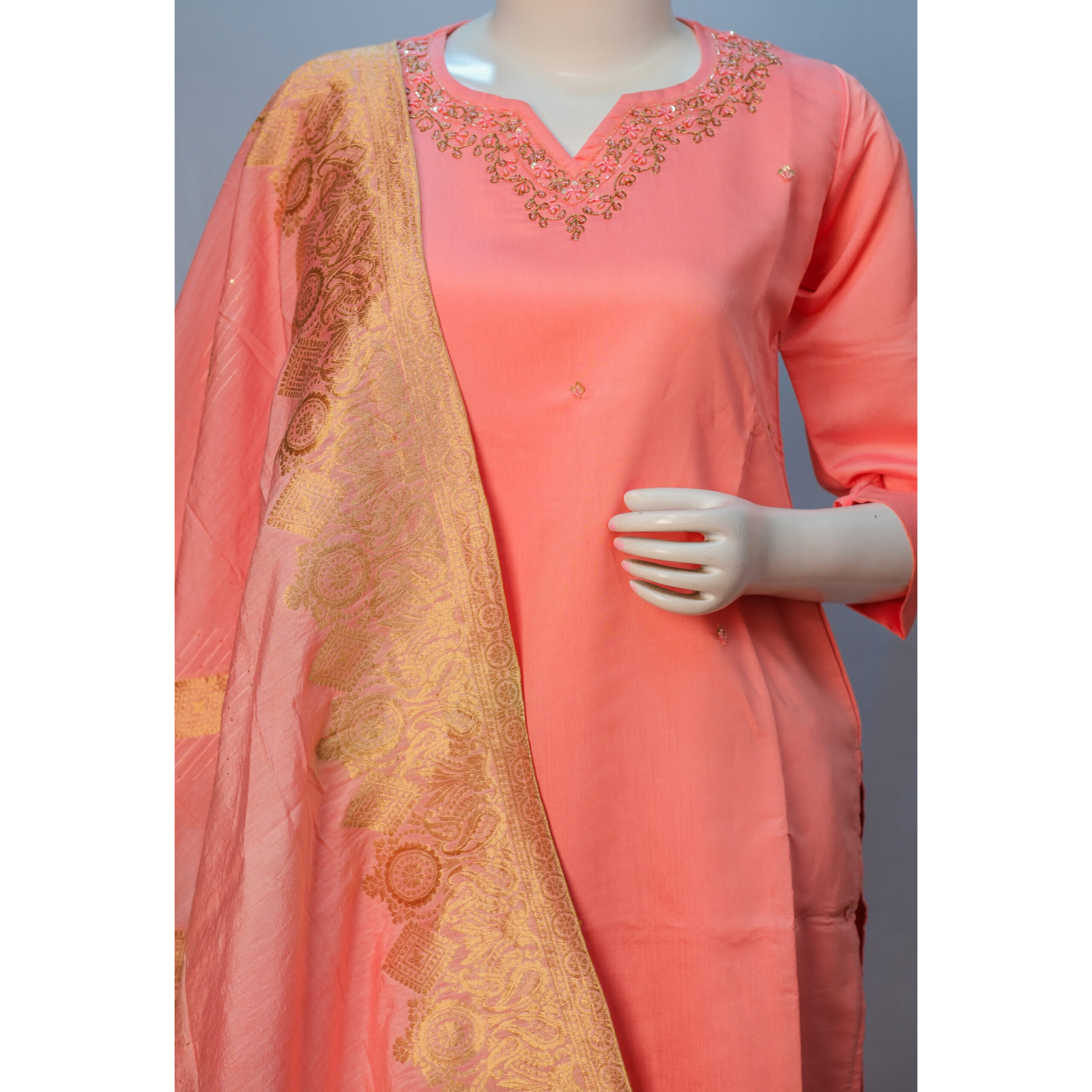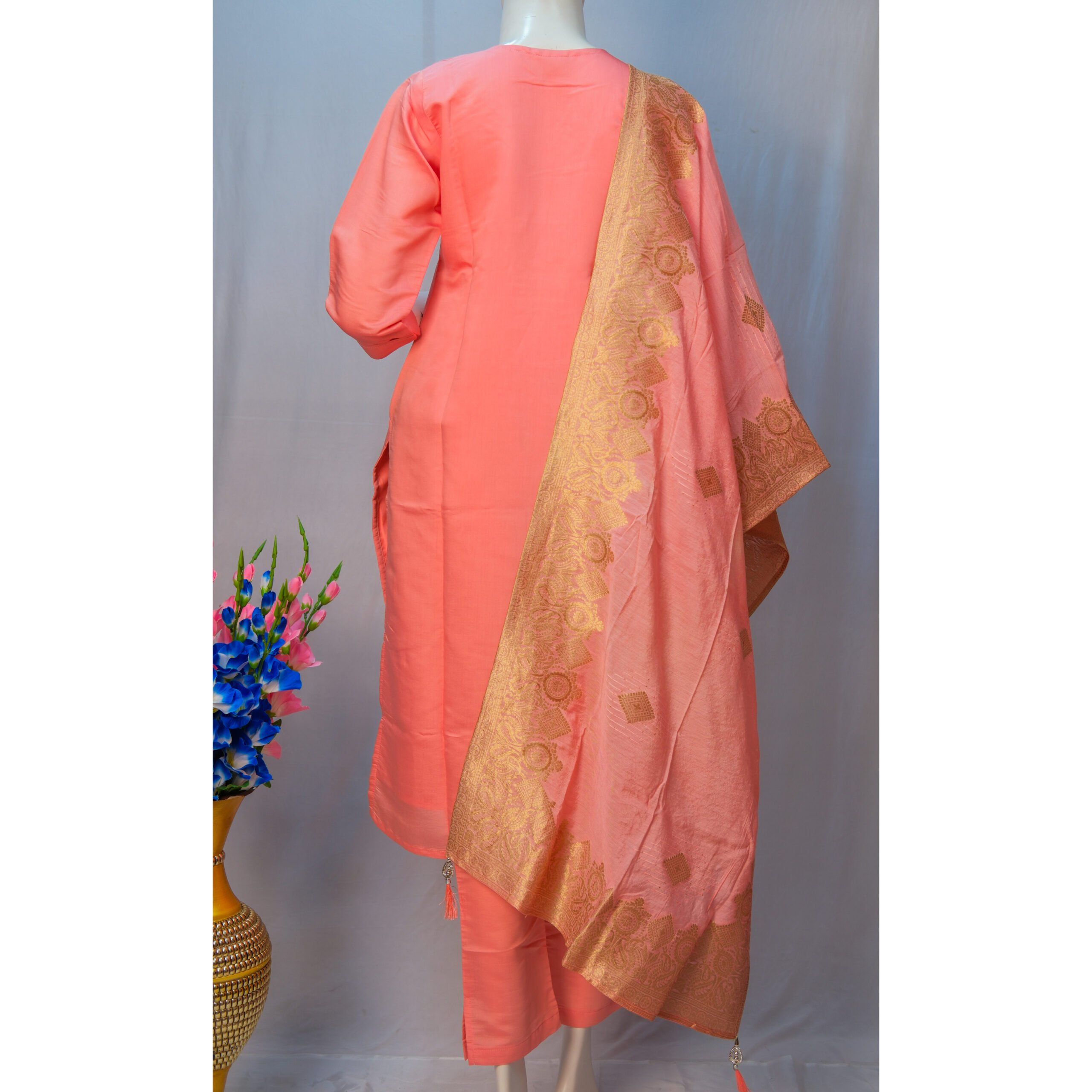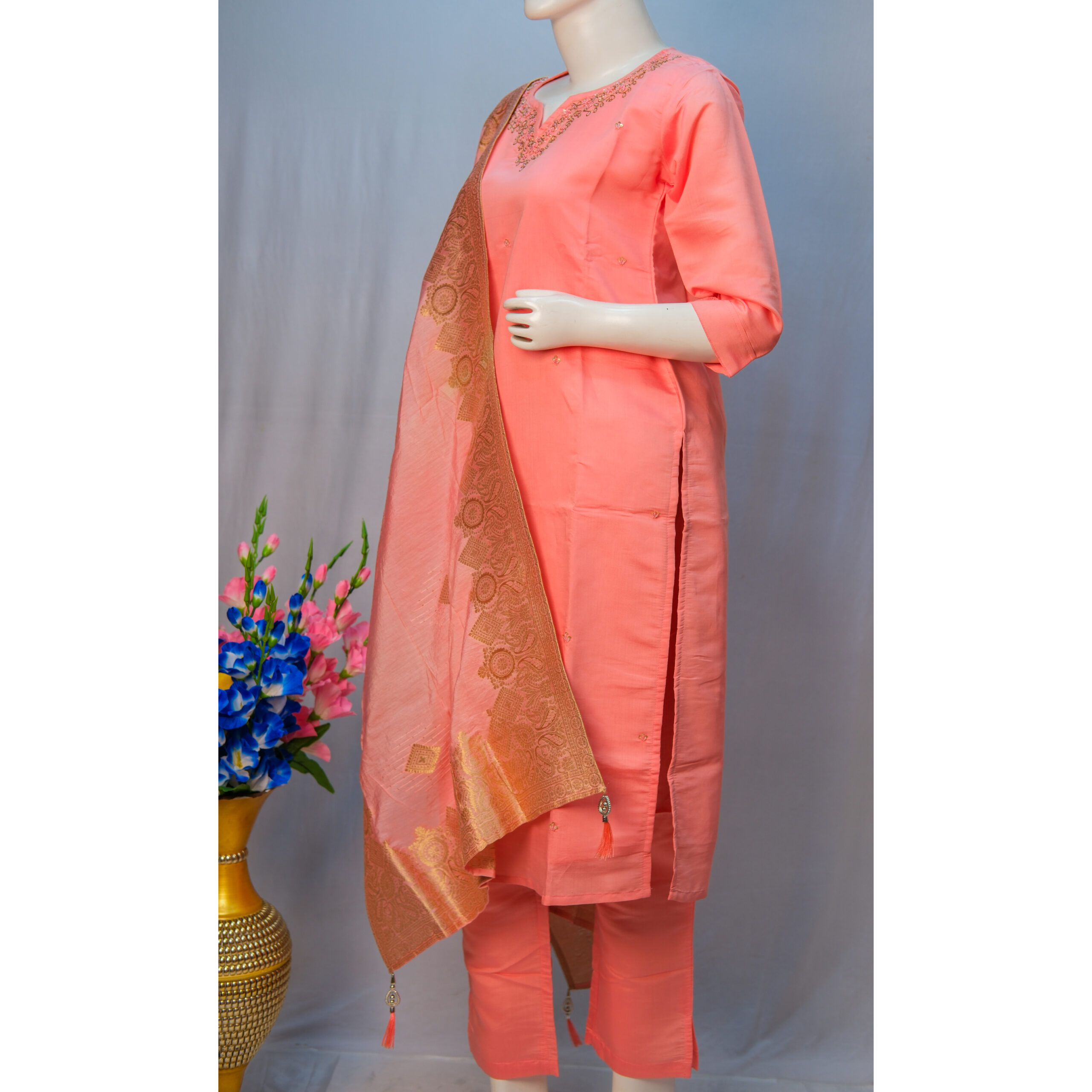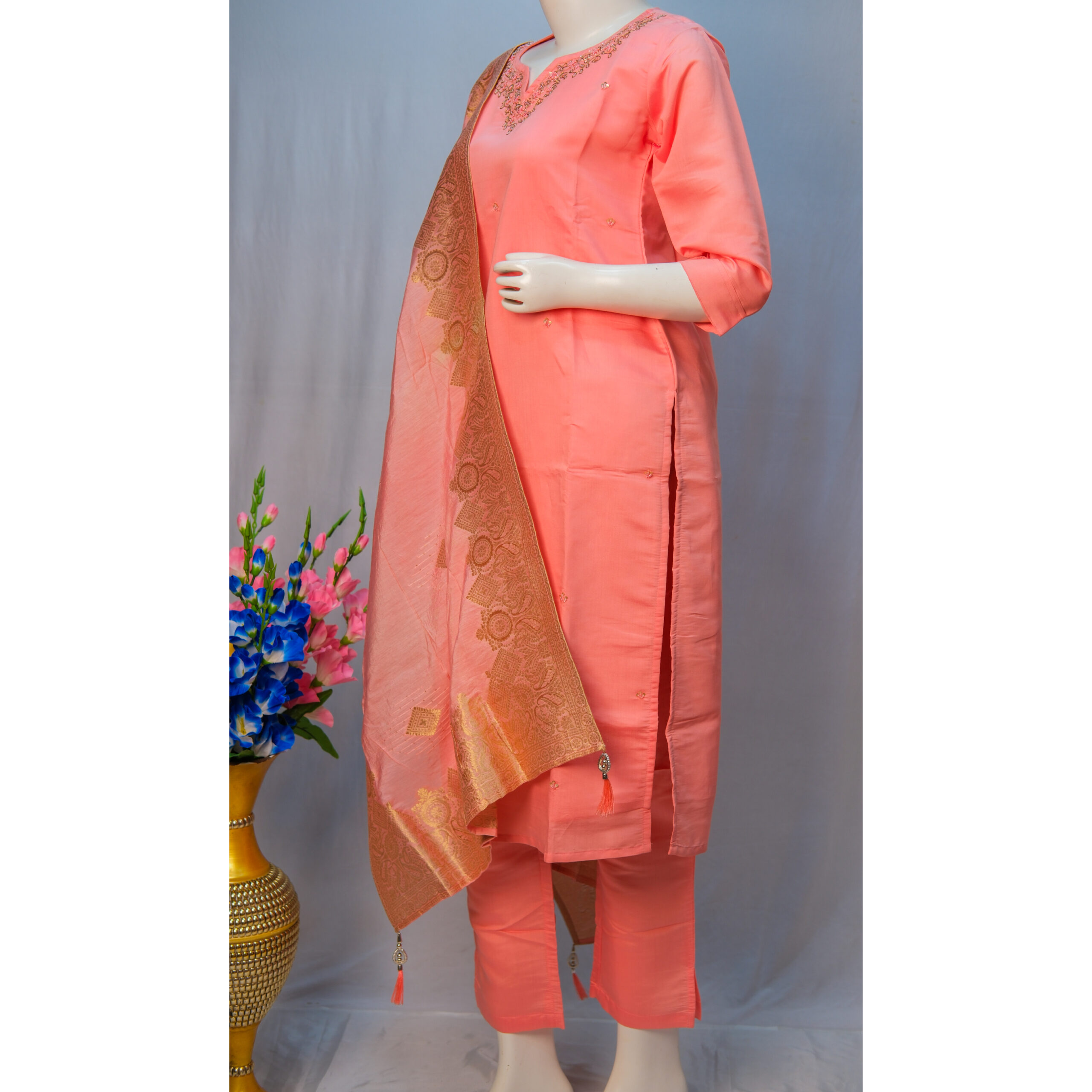 Step into timeless elegance with this exquisite 3-piece light pink churidar set. The ensemble includes a gracefully tailored kurta crafted from soft, breathable fabric, paired with a comfortable churidar bottom that ensures a flattering silhouette. The look is completed with a matching dupatta featuring delicate detailing that enhances its charm. Ideal for festive celebrations, weddings, or casual ethnic outings, this light pink set embodies a perfect blend of comfort, sophistication, and traditional style. Accessorize with subtle jewelry and classic footwear to complete your elegant look.