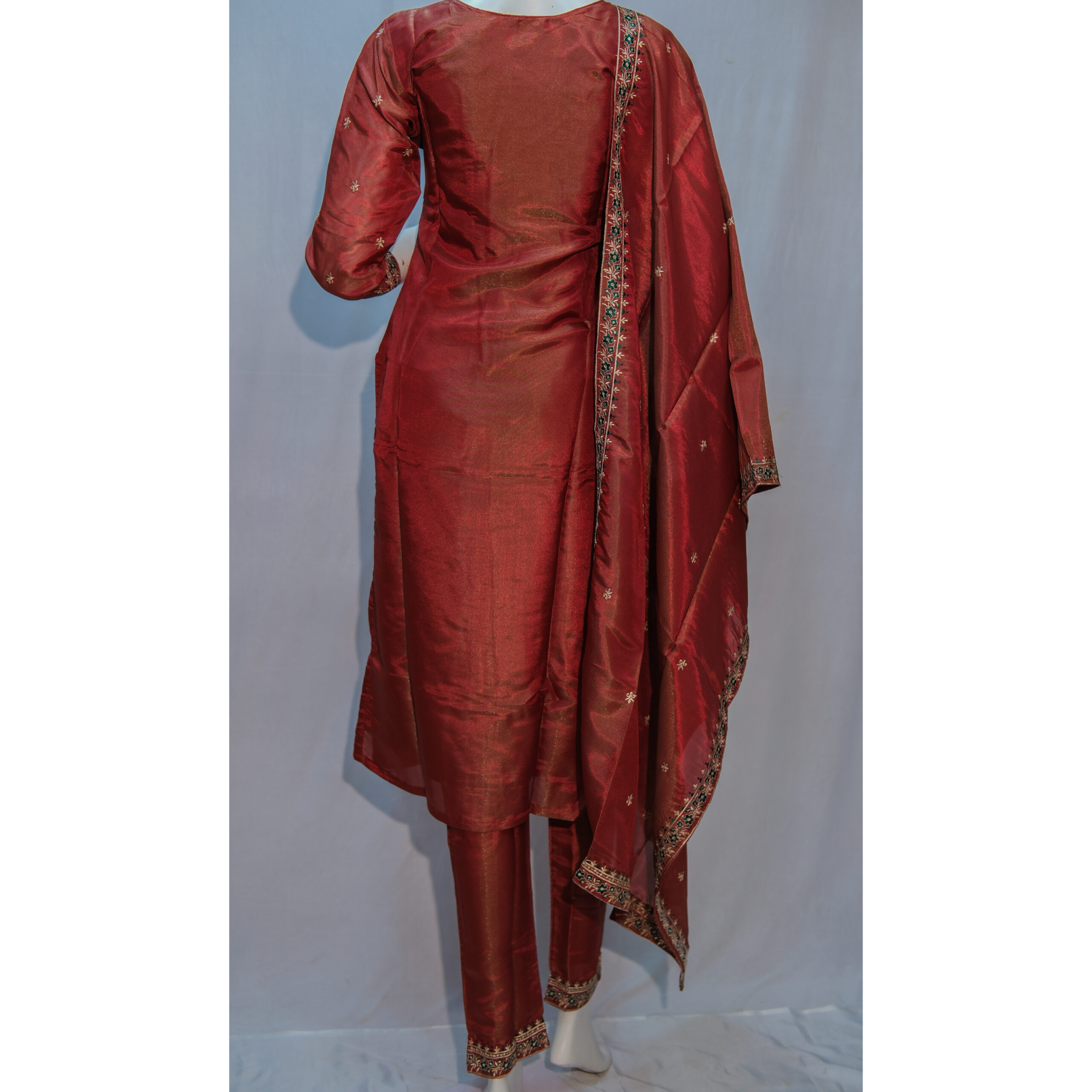 Radiate timeless charm with this exquisite Reddish Brown 3-Piece Churidar Set, crafted to bring together traditional elegance and modern sophistication. The set includes a gracefully tailored kurta, a coordinated churidar bottom, and a lightweight matching dupatta that completes your ethnic look.