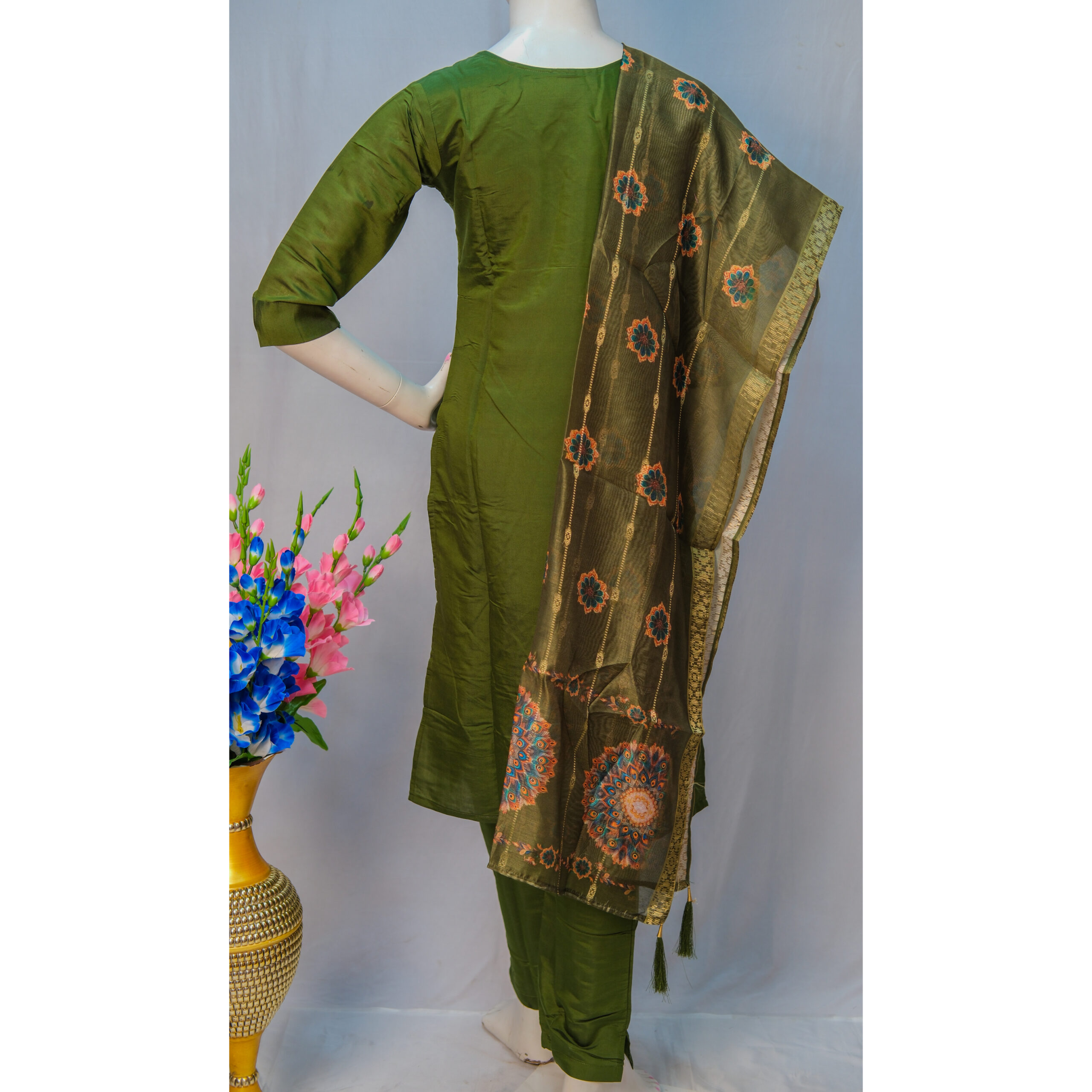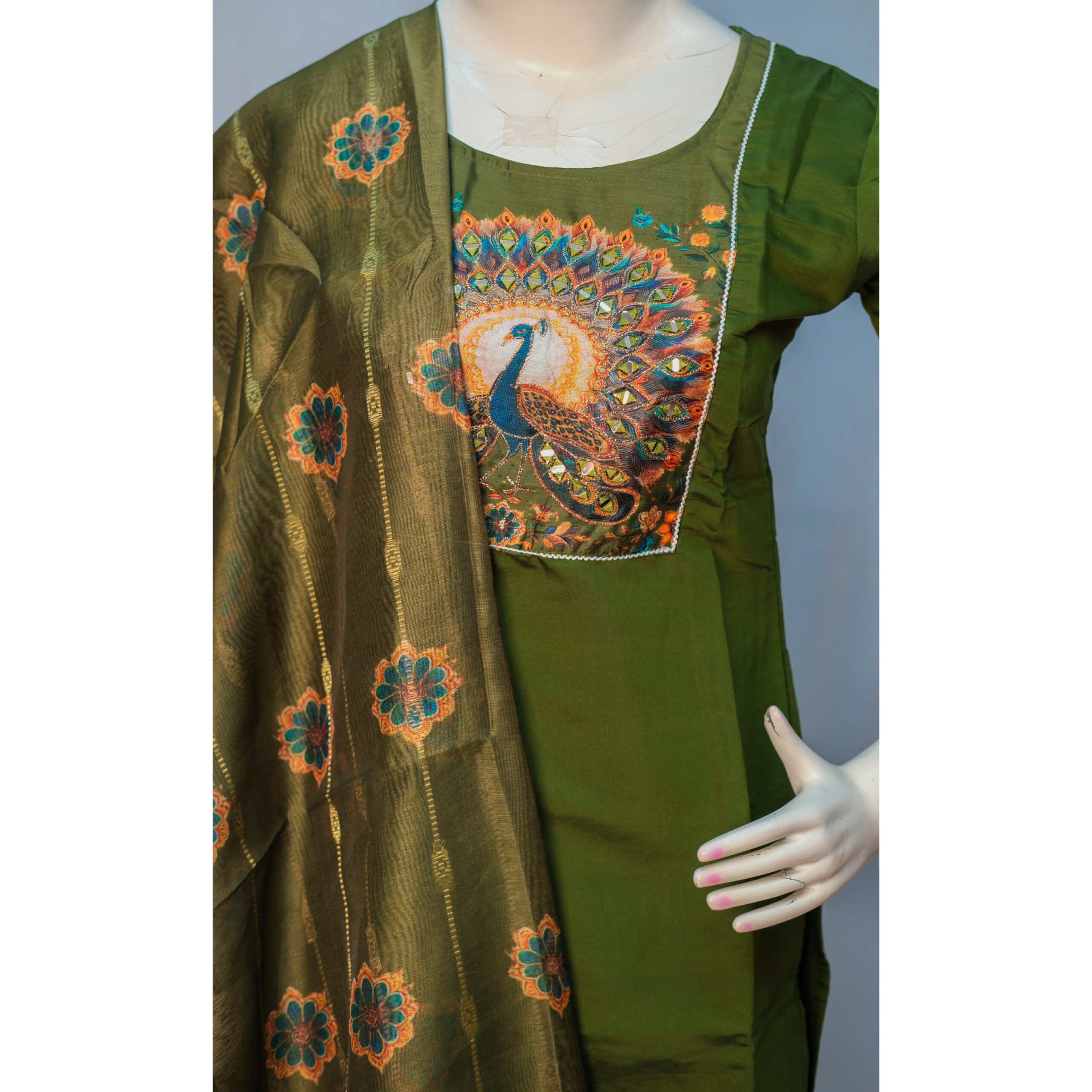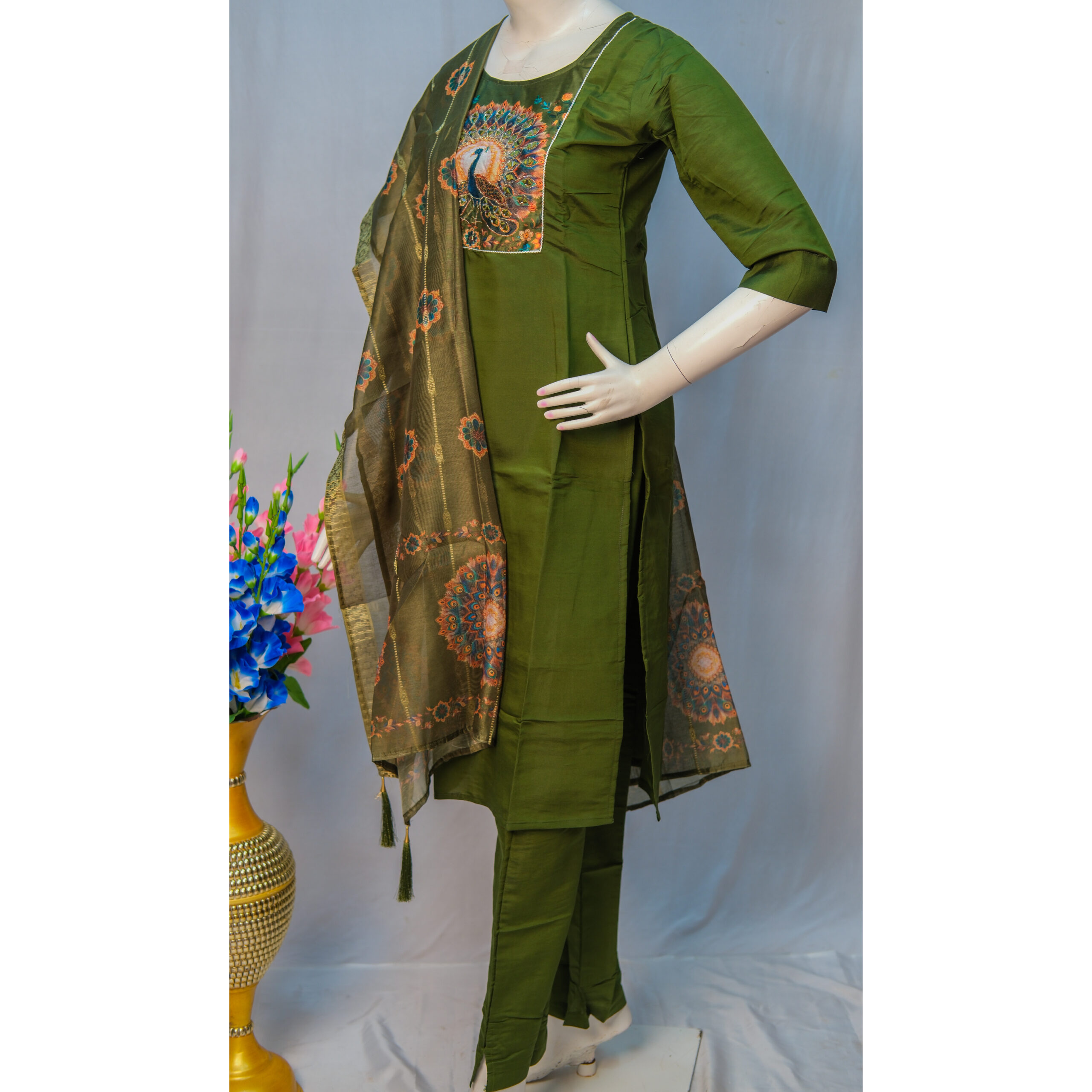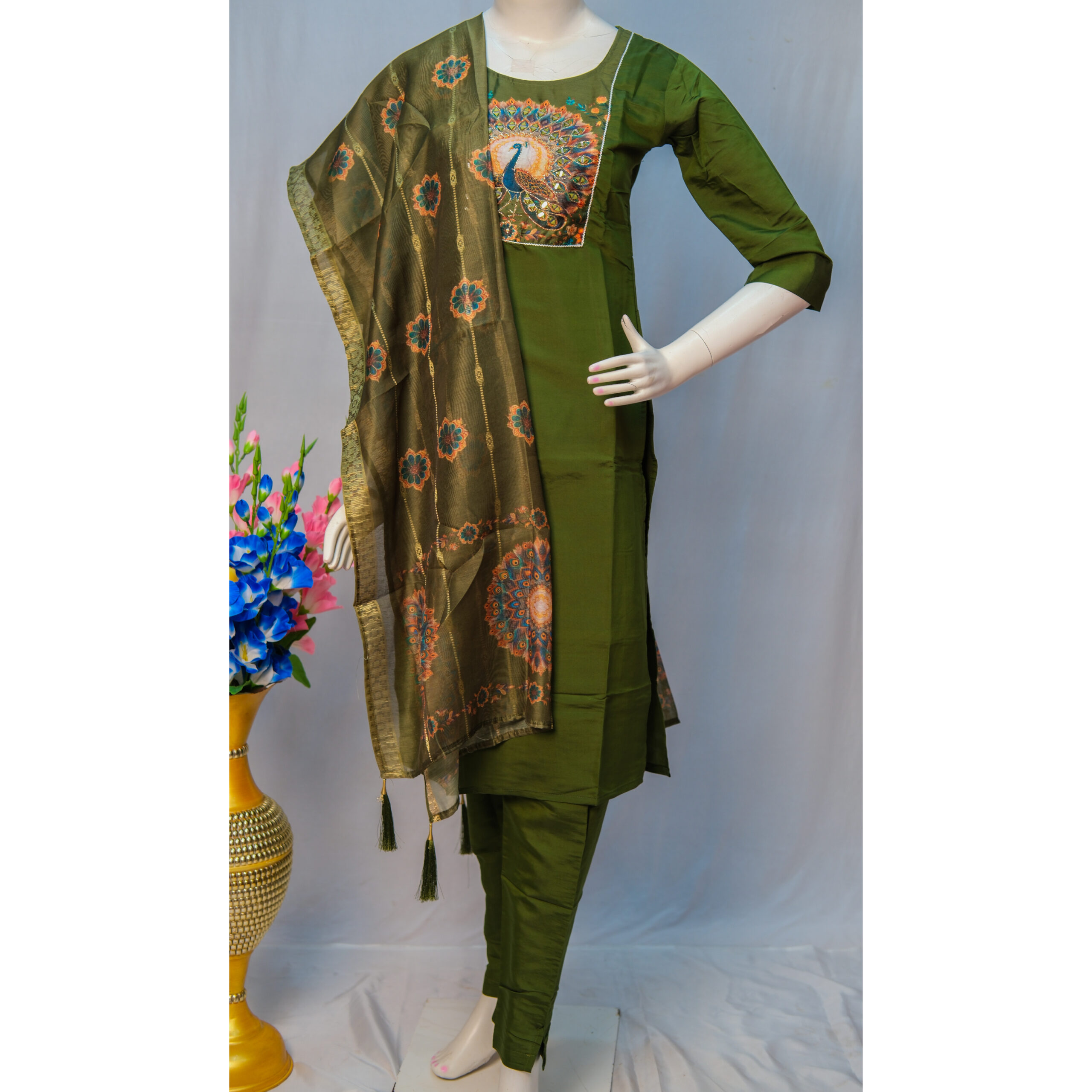 Add a touch of elegance to your ethnic collection with this stunning 3-Piece Peacock Print Churidar Set, featuring a beautifully patterned kurta, matching churidar, and a complementing dupatta. A perfect blend of color, comfort, and style.