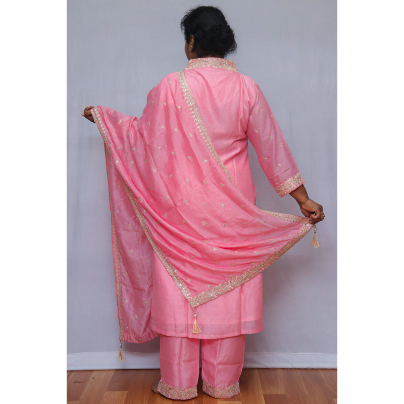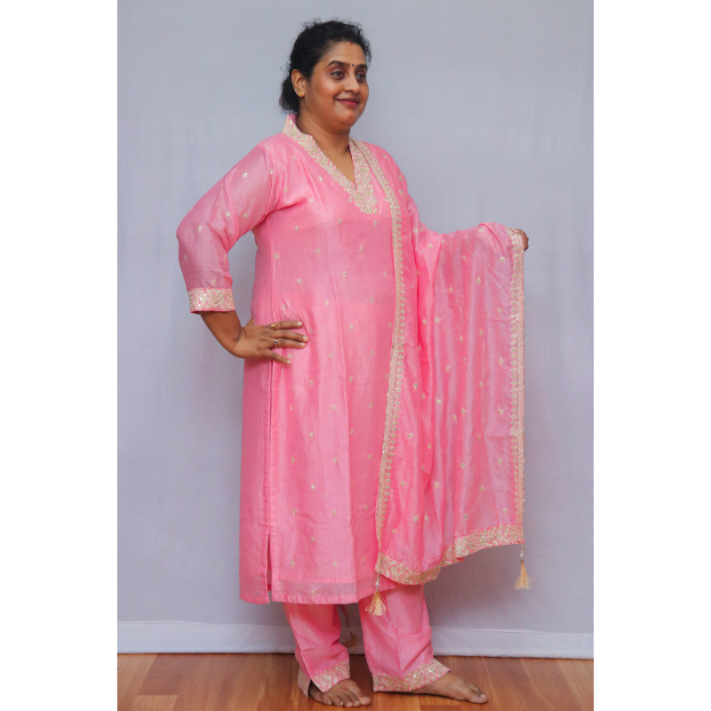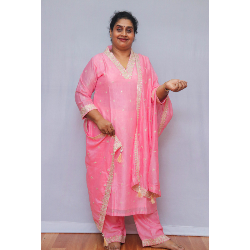 Step into subtle sophistication with this Baby Pink Kurta Dupatta Set, a perfect choice for those who appreciate understated elegance. Made from lightweight, breathable fabric—such as cotton, chanderi, or muslin—this kurta features delicate embroidery or minimalistic prints that highlight its graceful charm. The straight-cut or A-line silhouette offers a flattering fit for all body types, while the soothing baby pink hue brings a soft, feminine touch that’s ideal for daytime functions, poojas, brunches, or festive celebrations. The set is beautifully complemented by a matching or contrast dupatta adorned with subtle borders, tassels, or embroidery that elevate the overall look. Pair it with juttis and silver jewelry for a classic, ethereal outfit that’s both comfortable and captivating.
