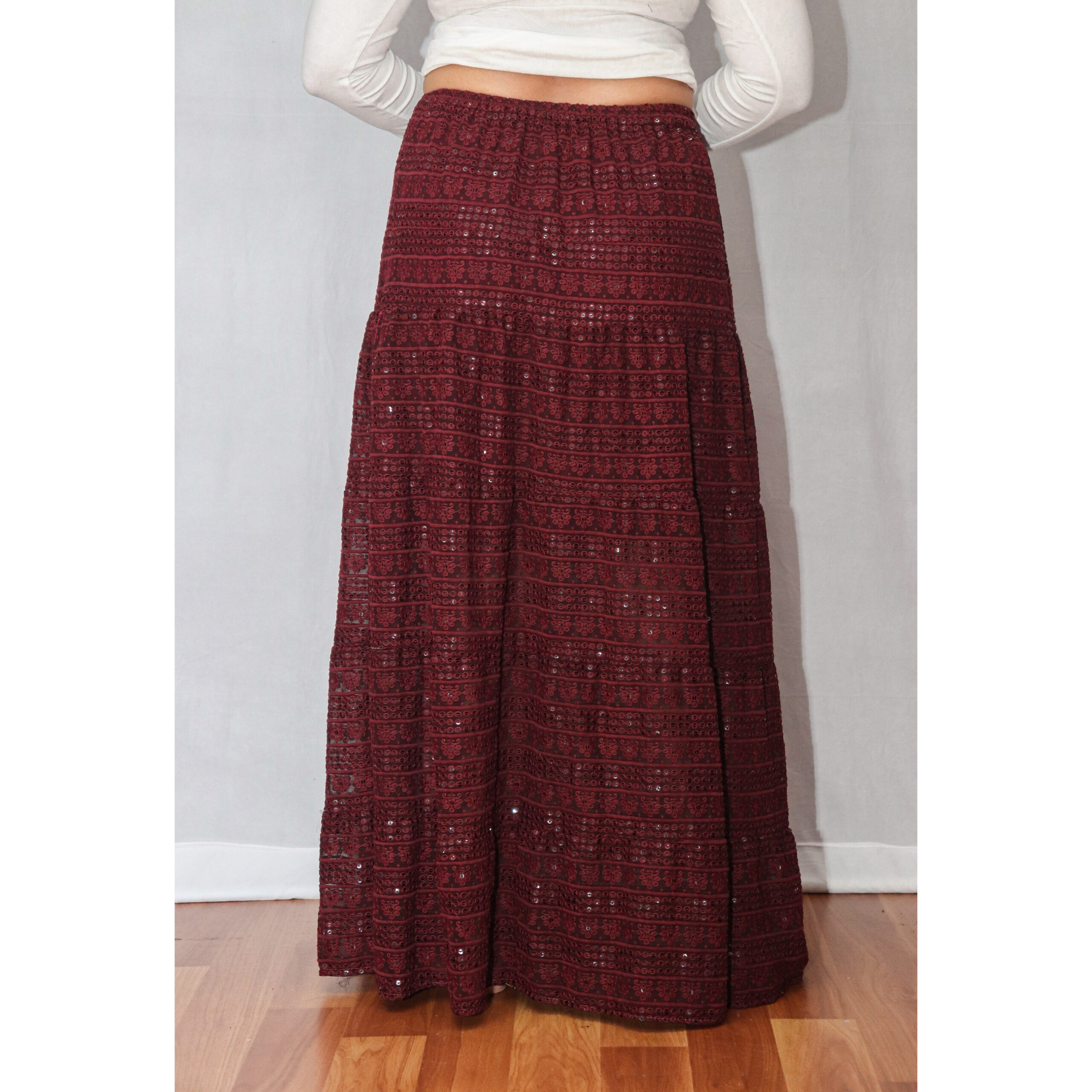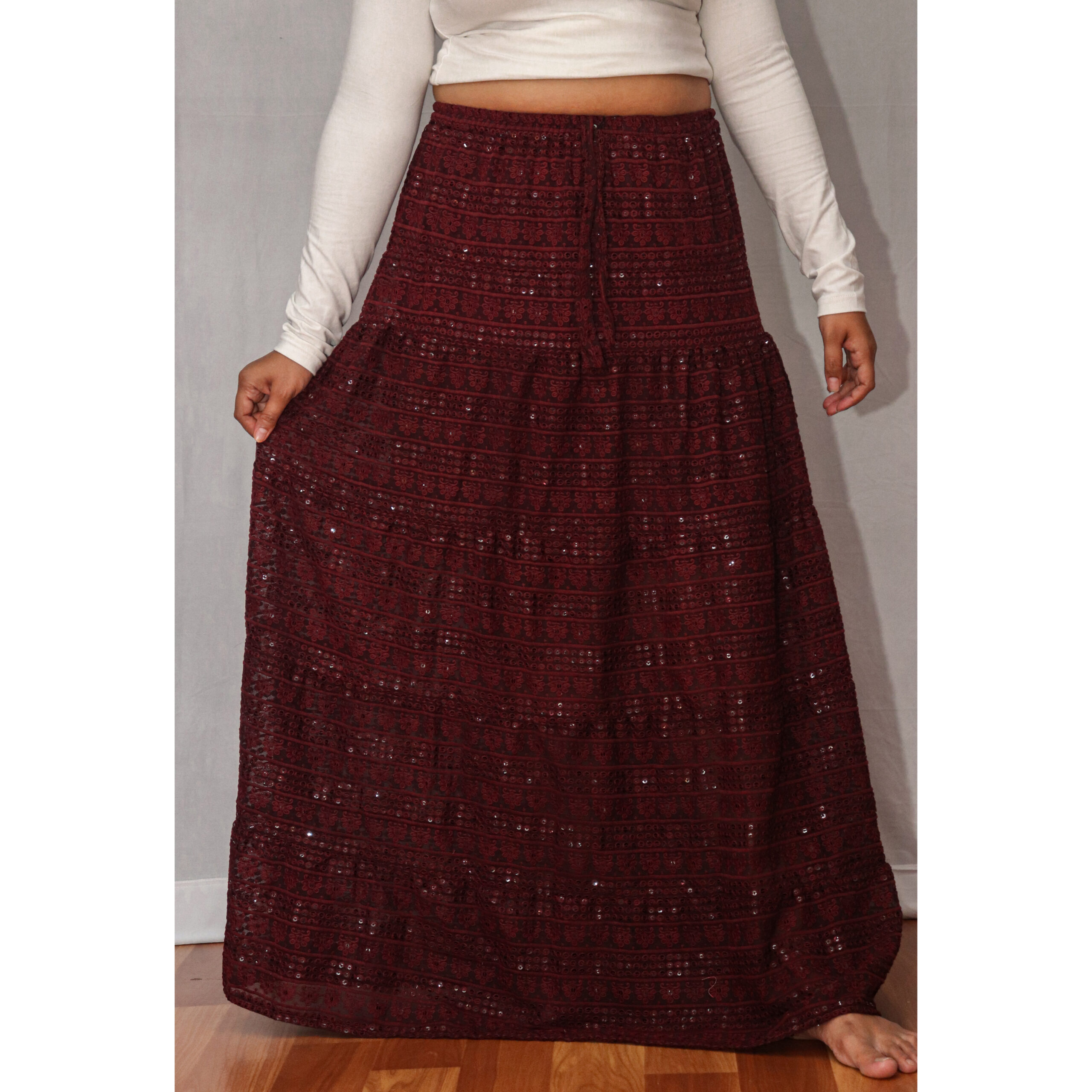 Add a bold, sophisticated touch to your wardrobe with our Dark Maroon Skirt—a versatile piece that blends timeless elegance with everyday comfort. Whether you’re dressing up for a celebration or creating a chic Indo-western look, this skirt makes a lasting impression. Design & Details: