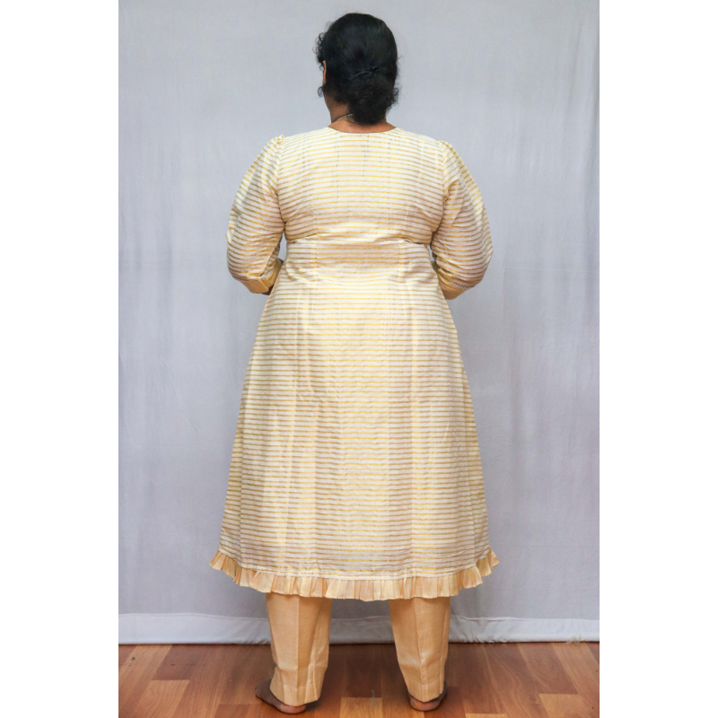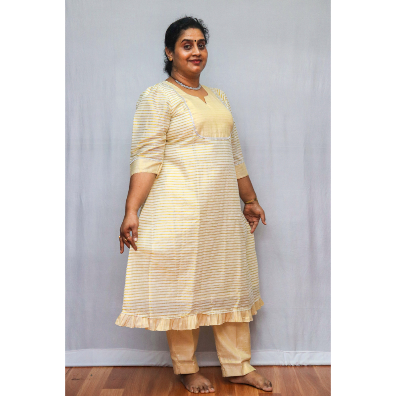 Celebrate traditional South Indian charm with this beautifully crafted Kerala-style kurti pant set. Inspired by the iconic Kerala saree, this ensemble typically features a serene off-white or cream base highlighted with elegant golden borders, giving it a rich yet understated appeal. The kurti is designed with a flattering silhouette, offering comfort without compromising on style, while the coordinated pants add a modern twist to this ethnic classic. Ideal for festive gatherings, Onam celebrations, temple visits, or cultural events, this set brings together tradition, grace, and everyday wearability. Pair it with gold jewelry and traditional sandals for a complete, refined look.