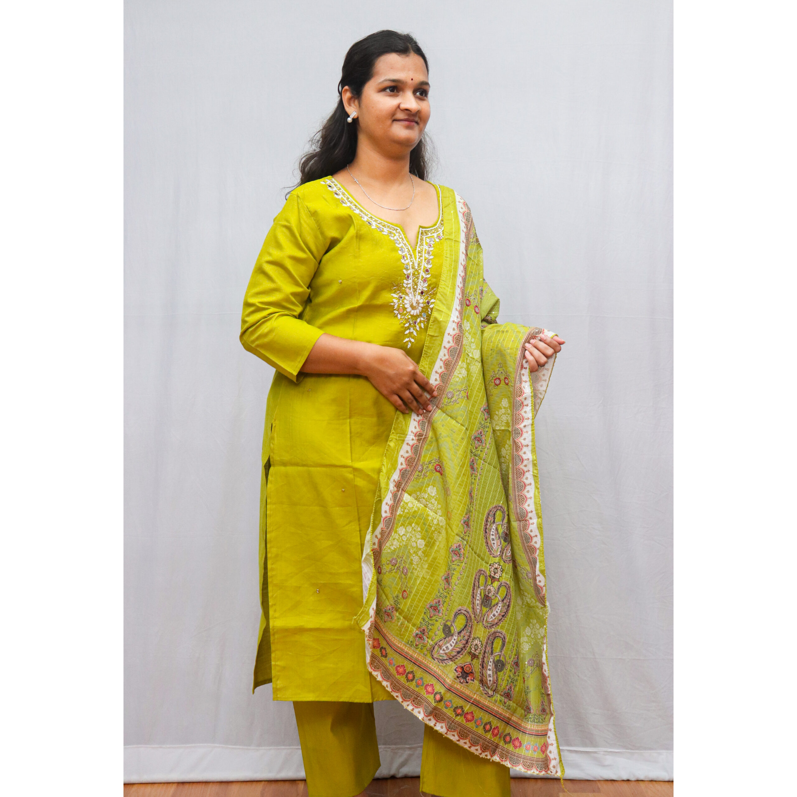 Make a striking style statement with this vibrant mustard kurta set, designed for modern elegance with a traditional twist. The kurta is beautifully adorned with delicate embroidered work on the neckline, sleeves, and hem, showcasing fine craftsmanship that adds a touch of sophistication.