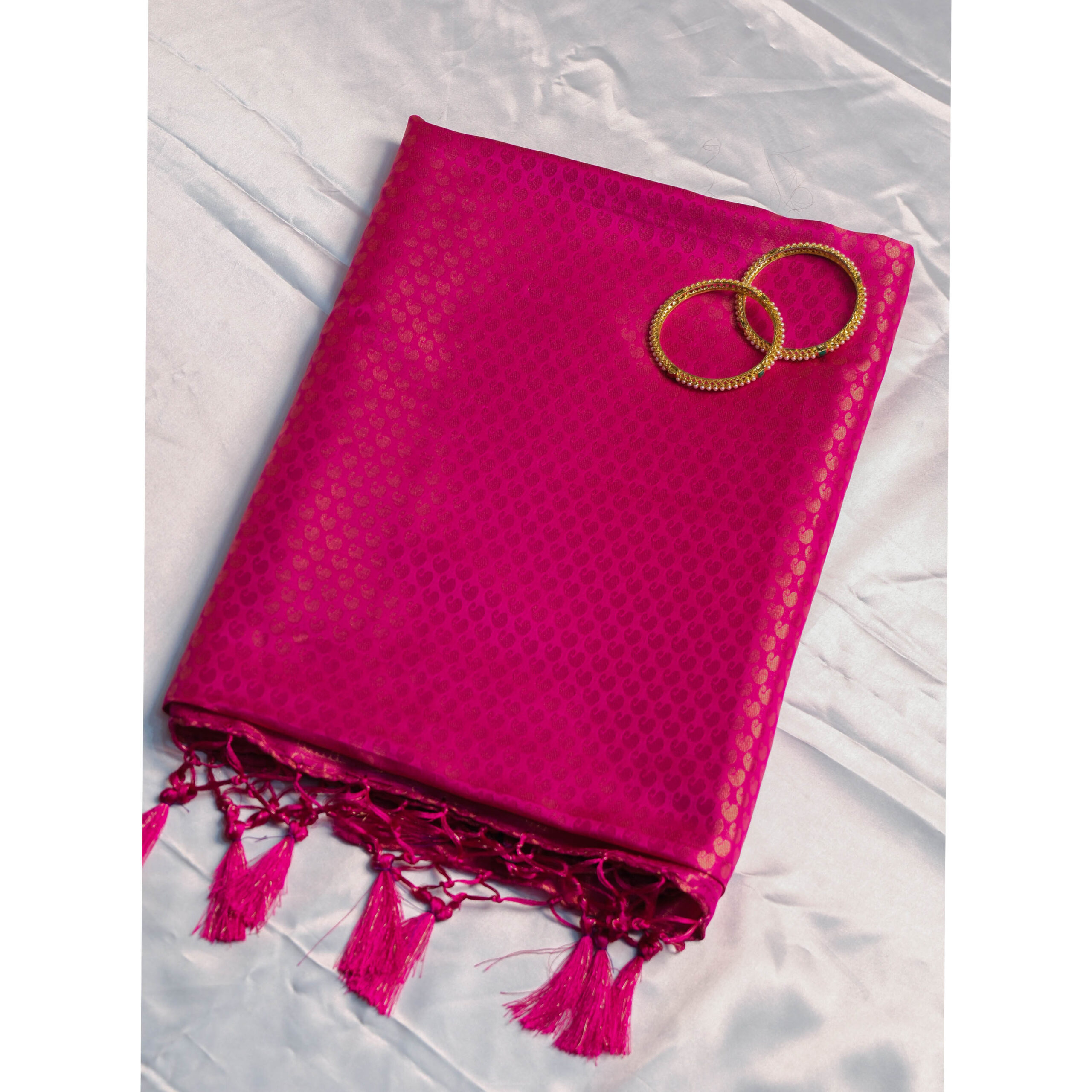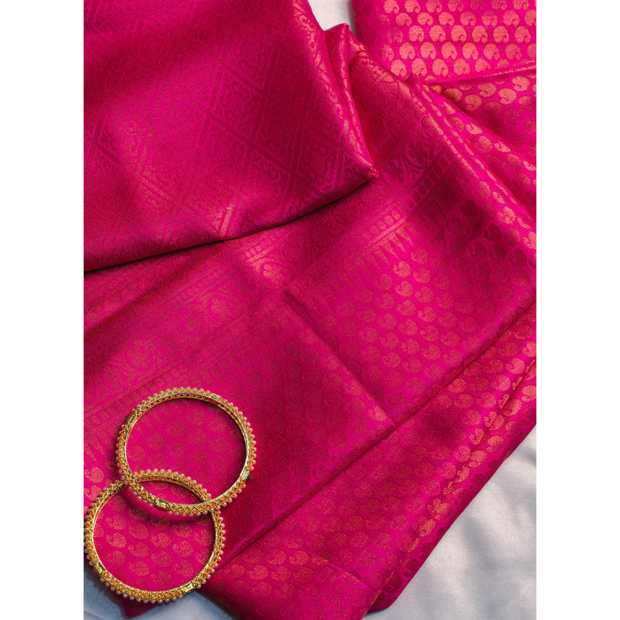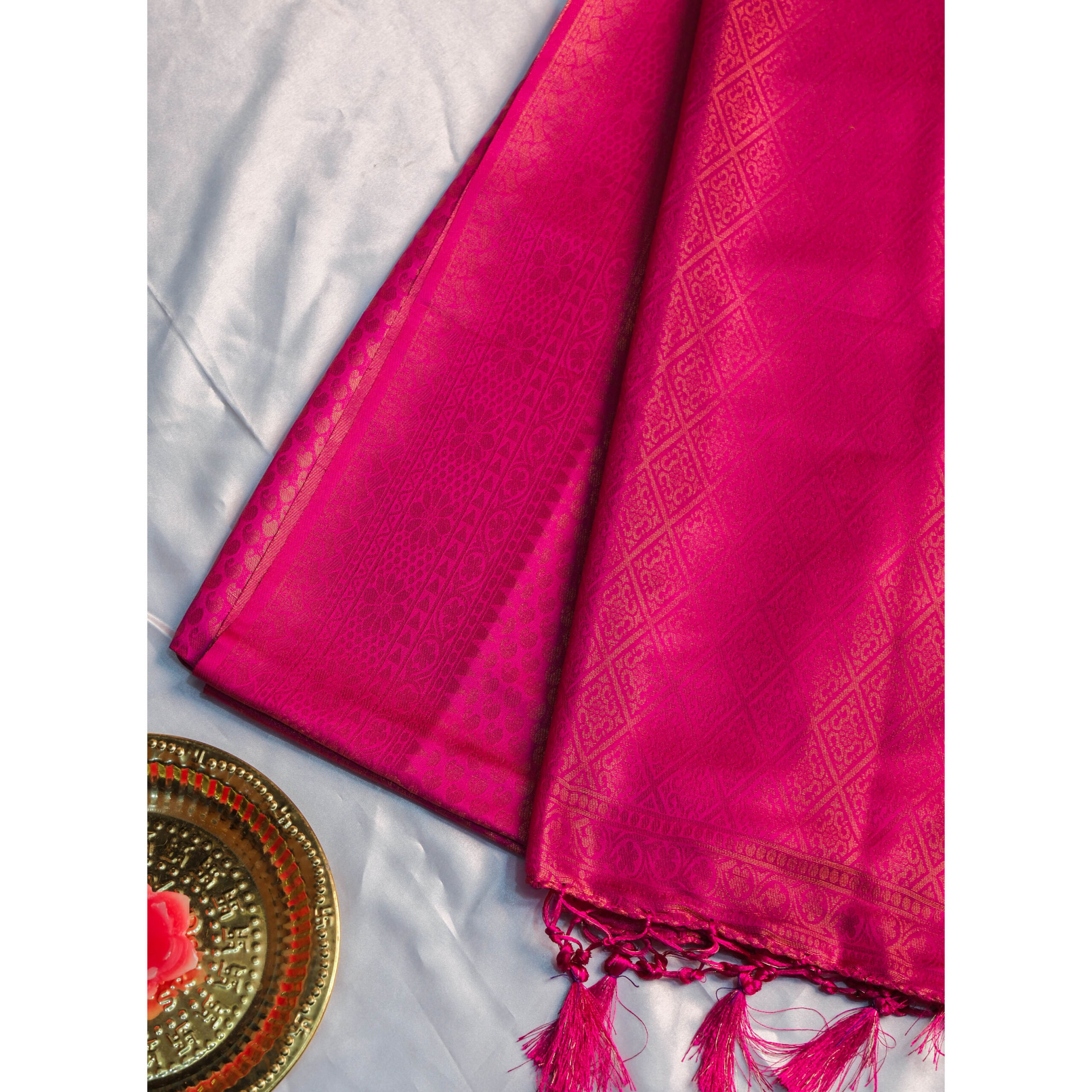 Turn every head with this stunning Pink Soft Silk Saree, crafted from premium-grade silk that feels feather-light and luxuriously smooth against the skin. The gentle pink hue adds a touch of femininity and grace, making it ideal for both traditional ceremonies and contemporary celebrations.
