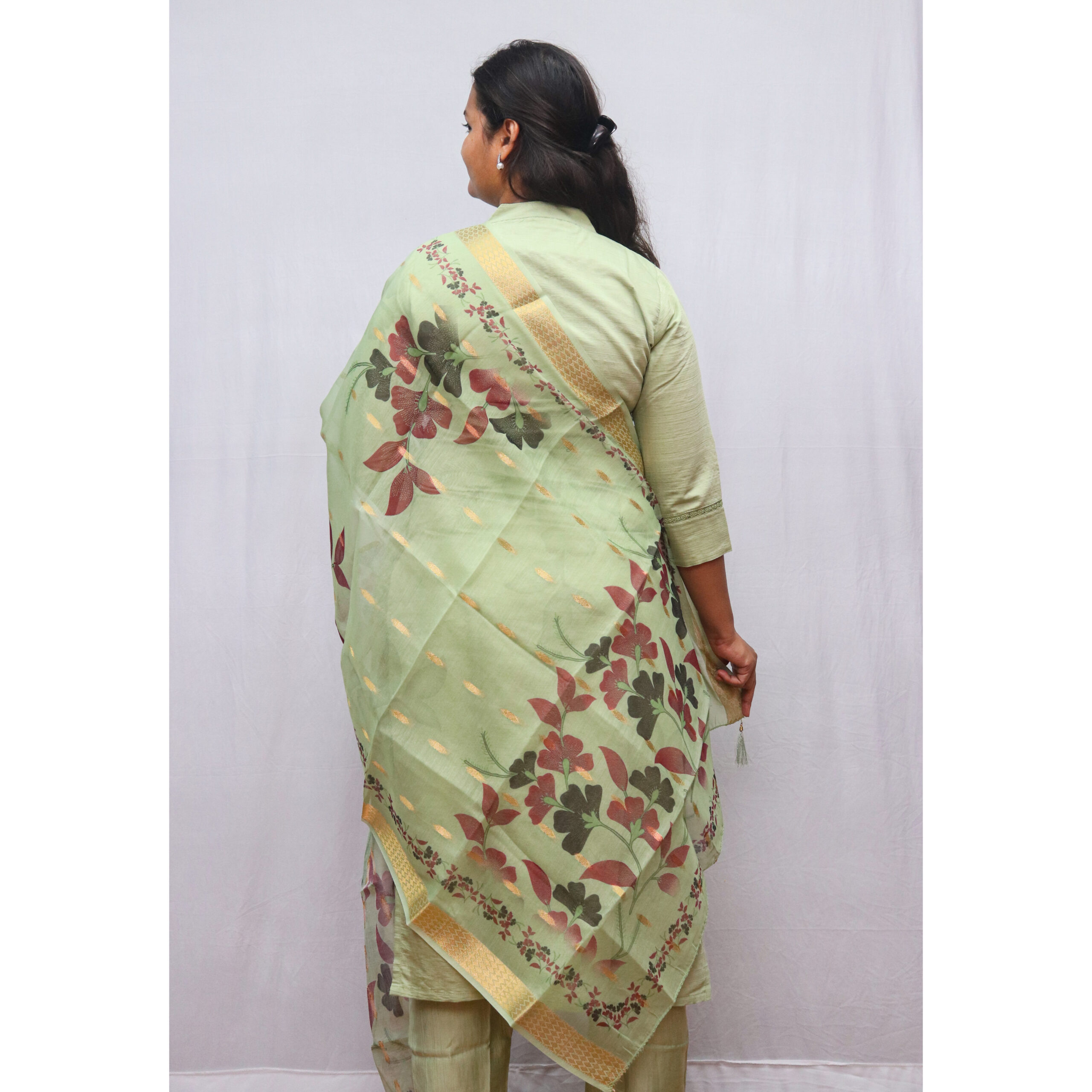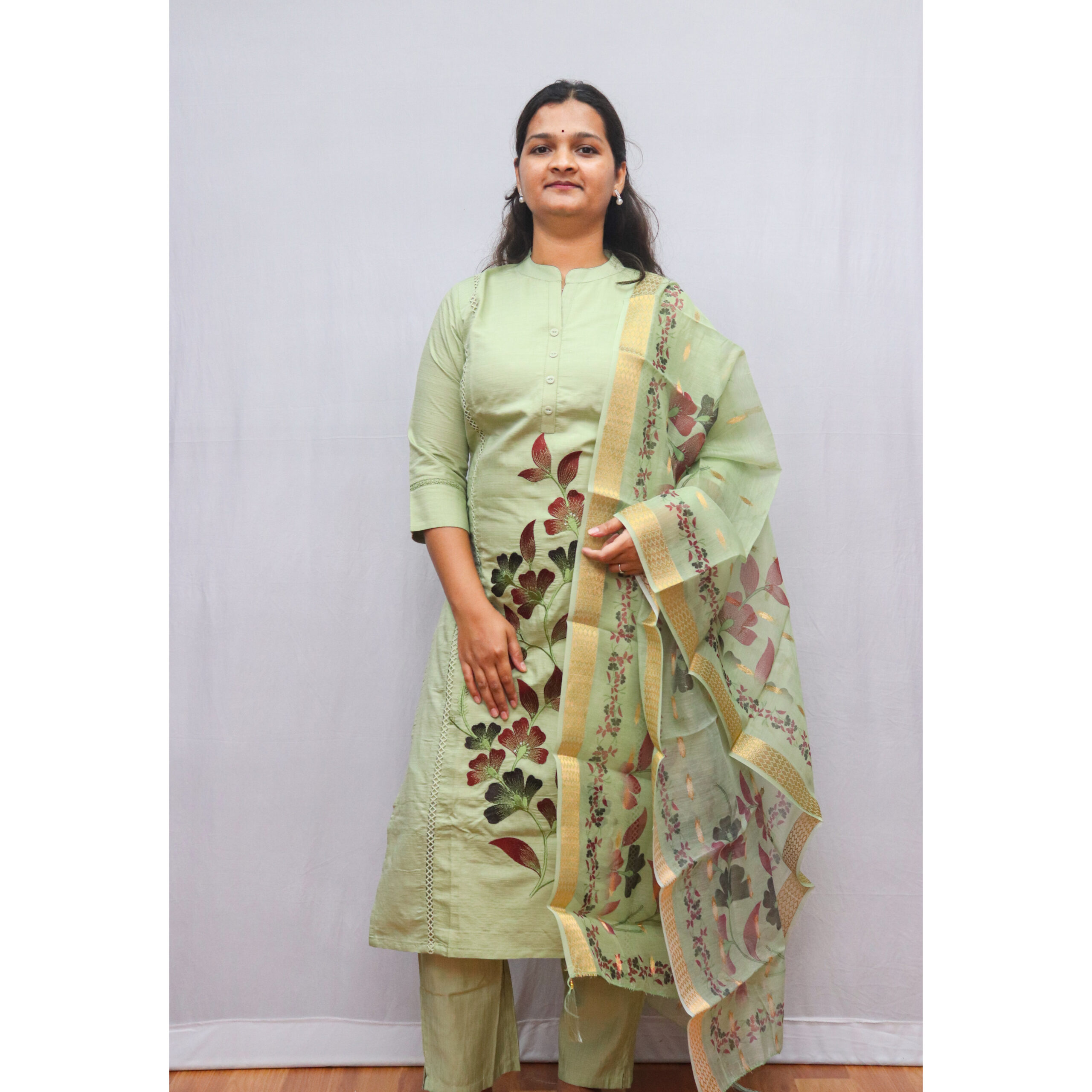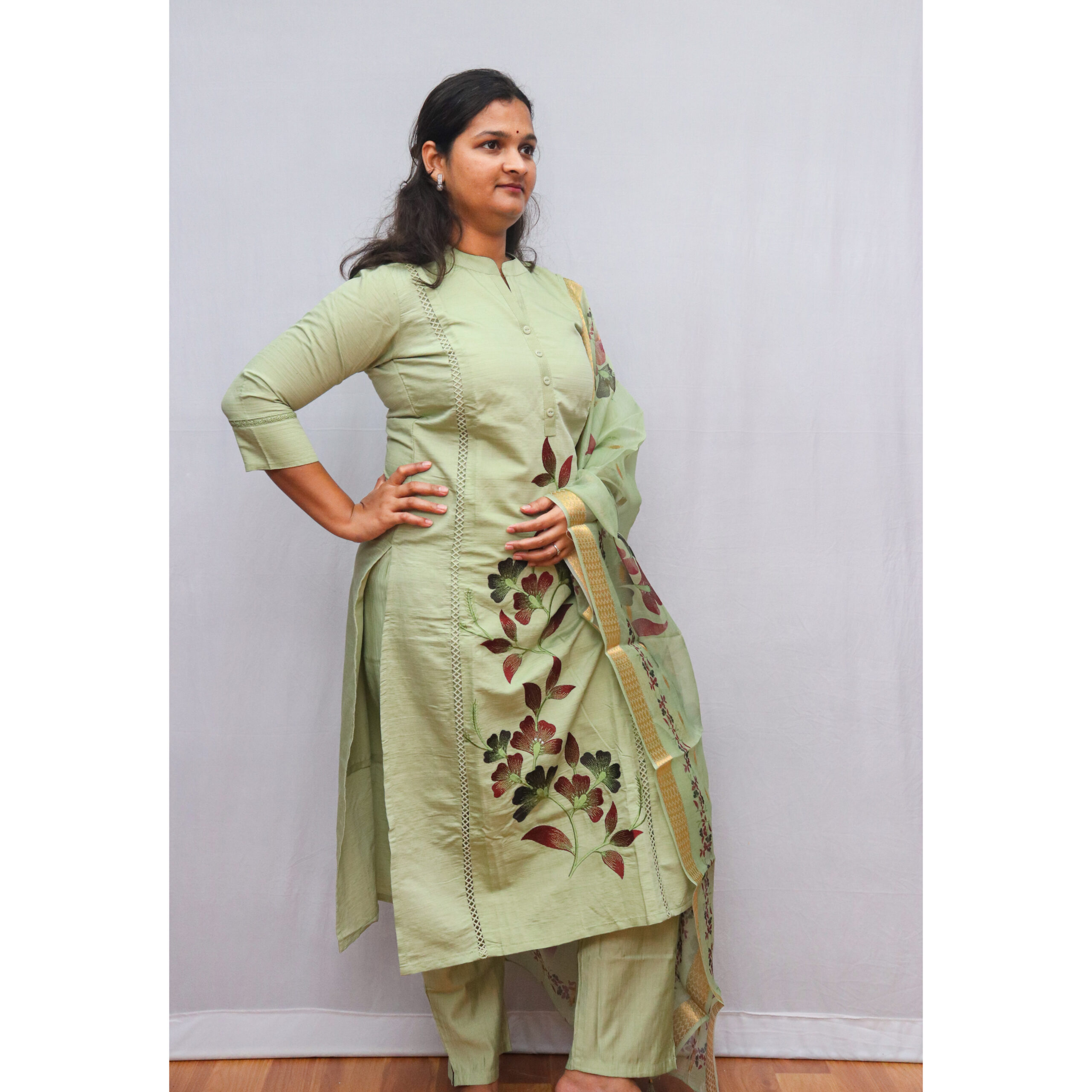 Gracefully designed in a soft pista green hue, this kurta set brings a refreshing twist to traditional wear. The kurta is adorned with delicate embroidery, lending it a refined and graceful touch without being overpowering. Paired with matching straight-fit pants, the ensemble offers a flattering silhouette that suits both festive celebrations and casual gatherings. Crafted from breathable, skin-friendly fabric, it ensures lasting comfort throughout the day. Whether styled with statement earrings for a festive look or worn with minimal accessories for everyday elegance, this pista green kurta set is a versatile addition to any modern ethnic wardrobe.