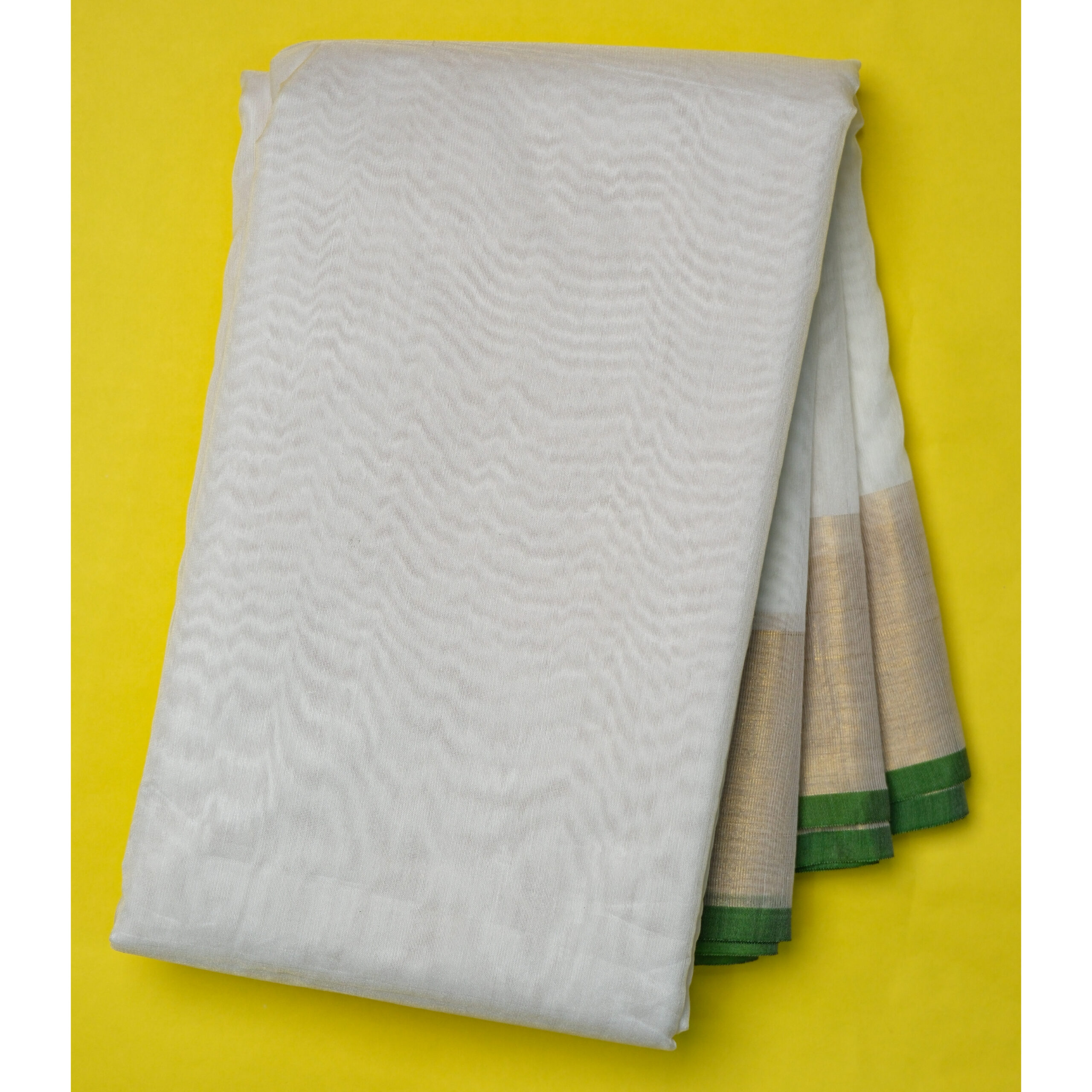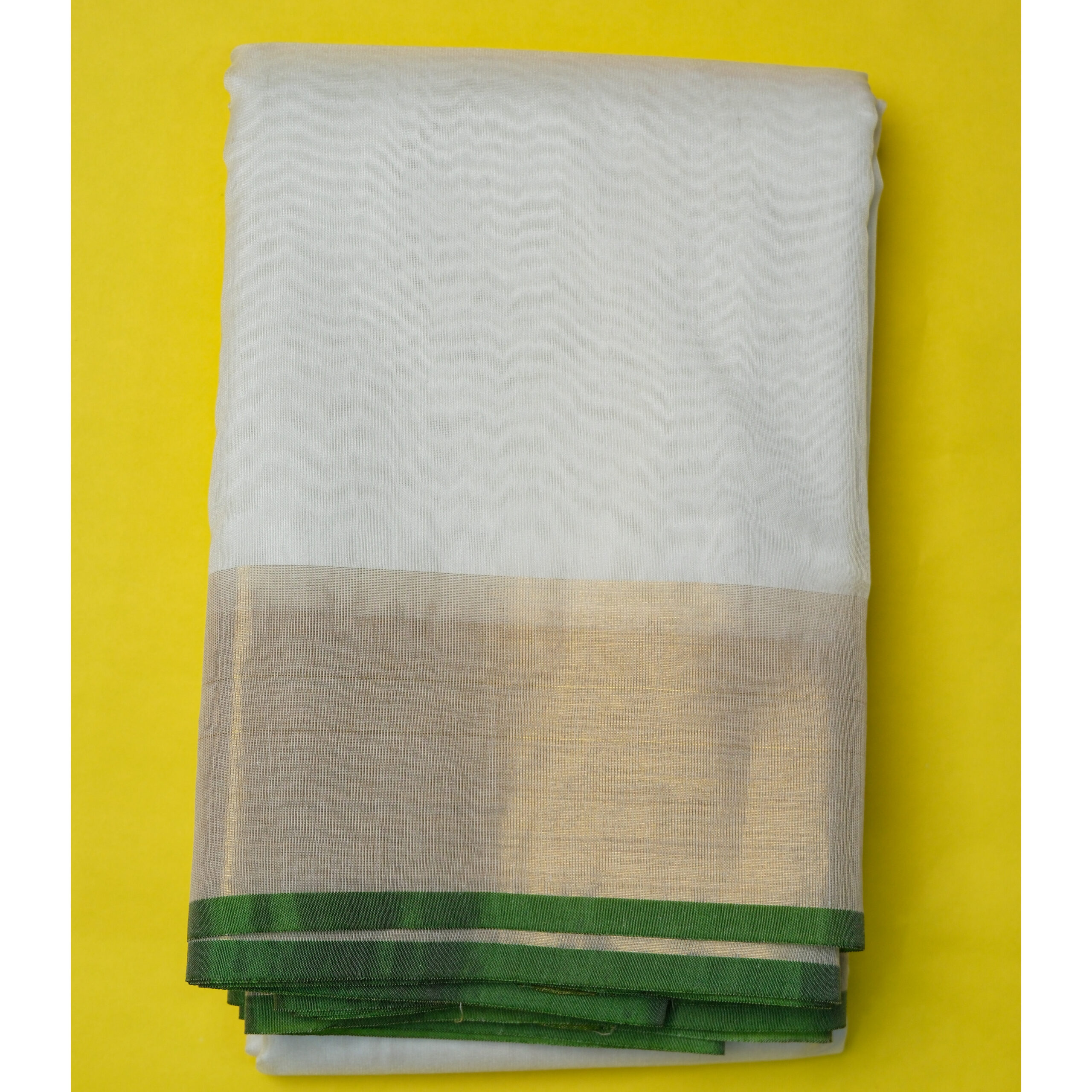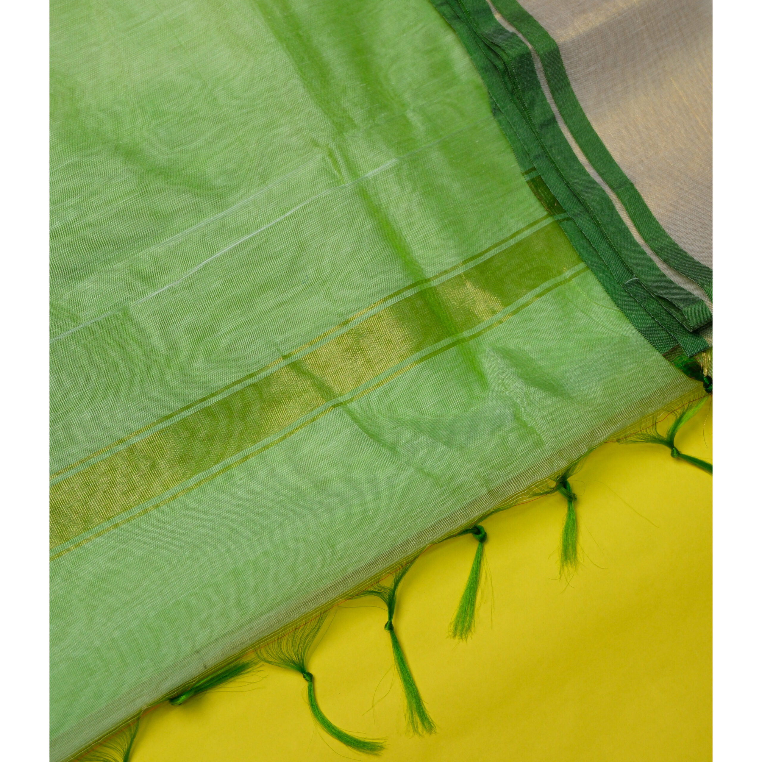The body of the saree showcases a rich green base, subtly enriched with woven motifs or plain field (depending on the variant), and is framed by a contrasting border—this could be metallic zari, thread work or a classic solid design—which adds a refined outline to the silhouette. The pallu complements the overall drape, often featuring intricate weaving or decorative motifs that reflect traditional craftsmanship.
