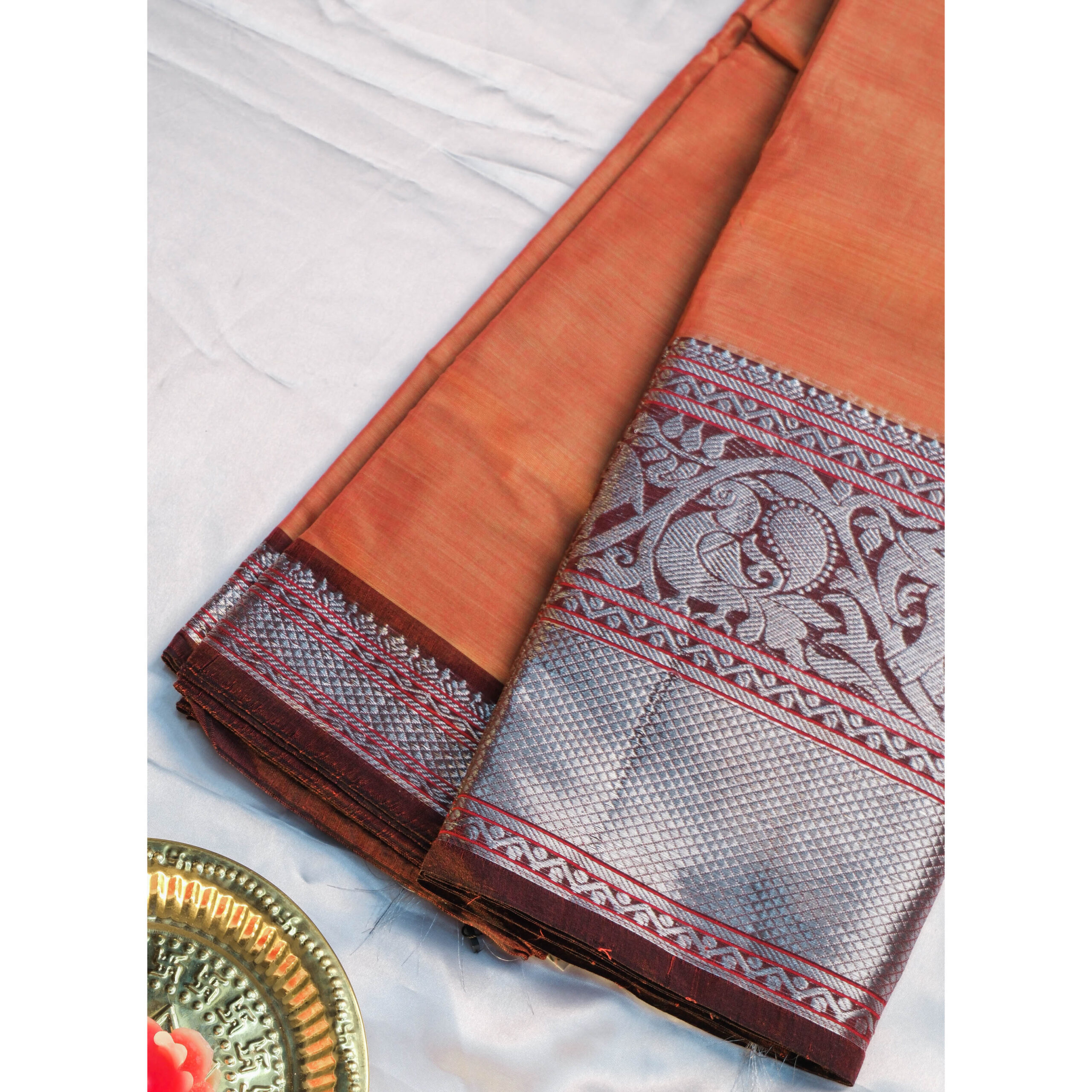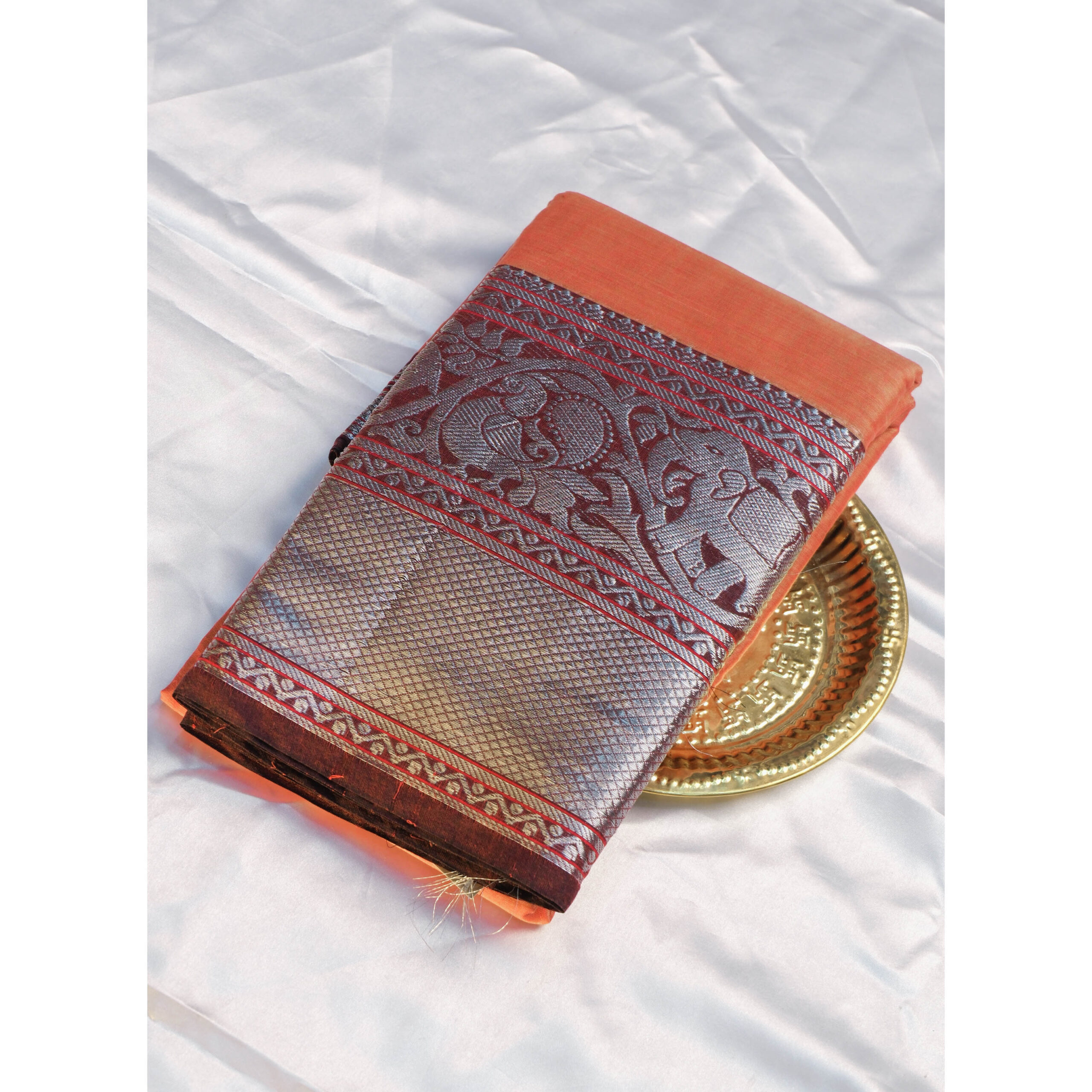 Perfect for cultural events, temple visits, or elegant daywear, this saree reflects the charm of traditional Indian weaving with a modern, refined touch. Its lightweight feel ensures ease of movement, while the silver detailing lends a graceful shimmer under any light.