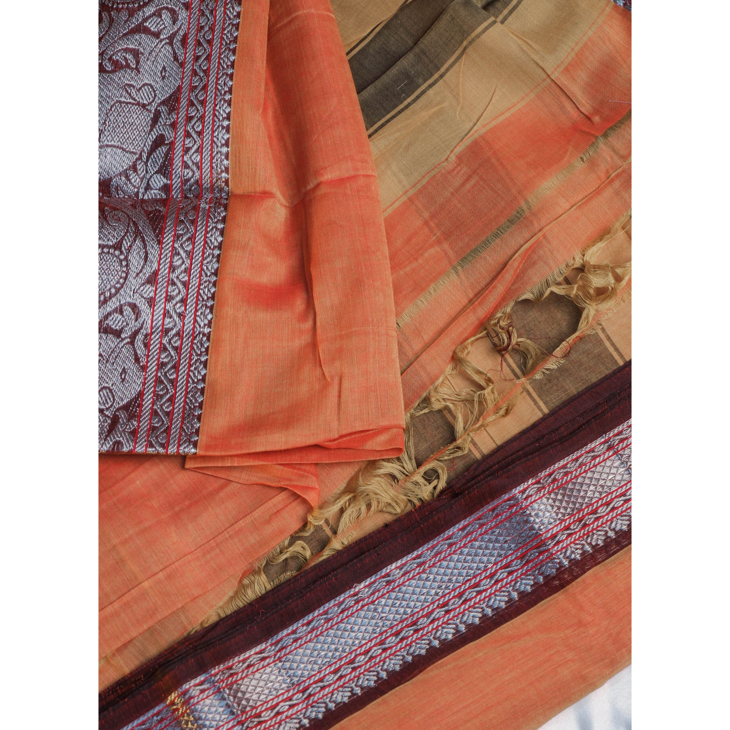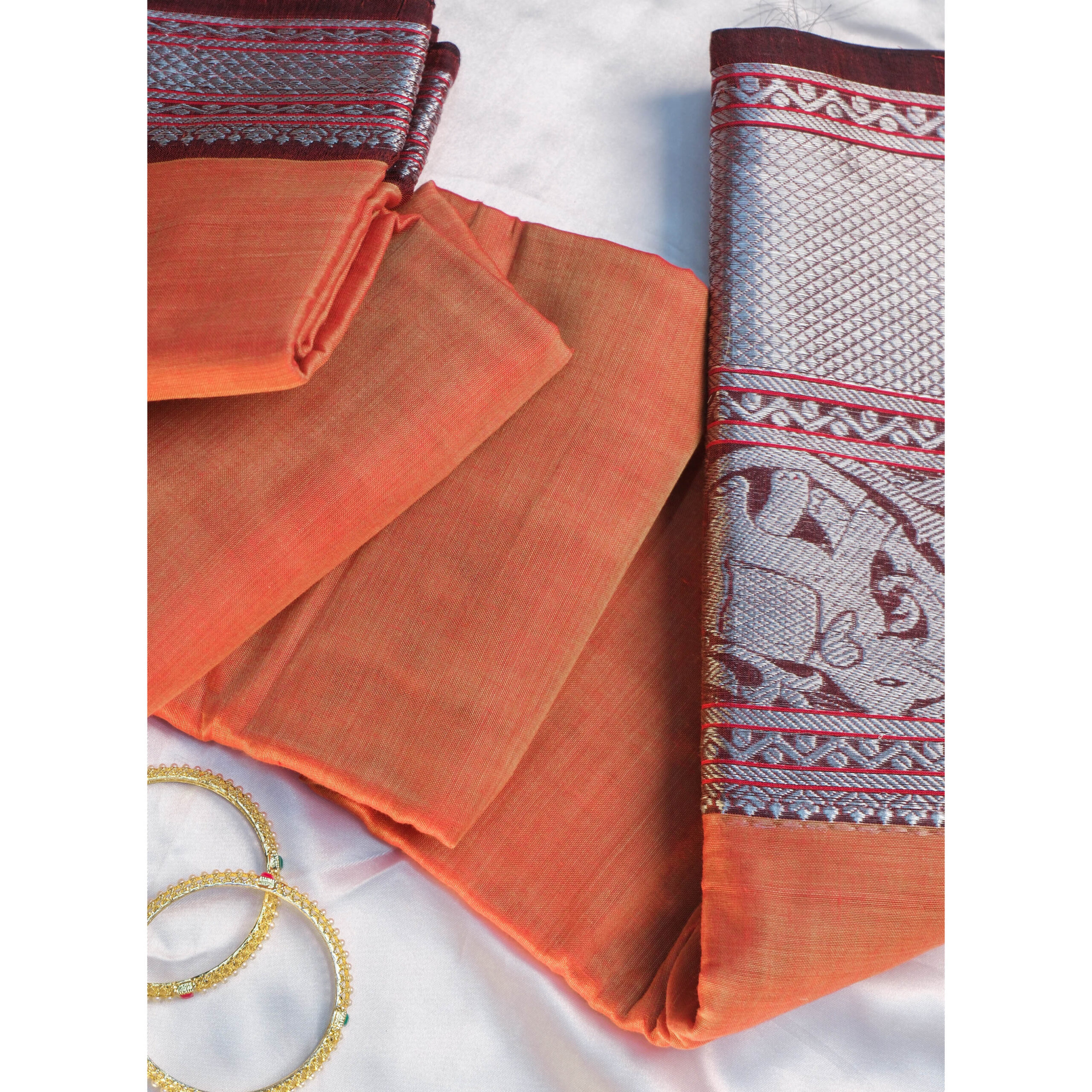 The Silver Border Pure Cotton Saree is a beautiful expression of simplicity and sophistication. Handwoven from 100% pure cotton, this saree offers a soft, breathable texture that drapes effortlessly while keeping you cool and comfortable throughout the day. The understated silver border adds a touch of subtle glamour, making it suitable for both casual and festive occasions.